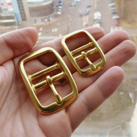 Латунная пряжка с двумя перекладинами. Особенность пряжки - можно не пробивать отверстие под язычок, а просто загибать полосу на перекладину, где нет язычка. Размеры: внешние: 3,7*5,7 см внутренние: .. Читать полностью