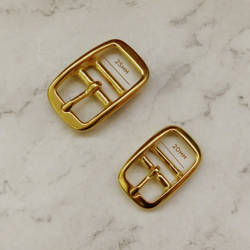 Латунная пряжка с двумя перекладинами. Особенность пряжки - можно не пробивать отверстие под язычок, а просто загибать полосу на перекладину, где нет язычка.