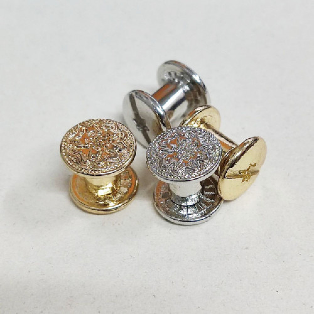 Двусторонний винт для крeплений кожаных ремней, для декора широкого круга изделий из кожи. Галантерейные винты оригинального дизайна подойдут для женских ремней и других галантерейных изделийМатериал - латунь с покрытием: золото и сереброD шляпки 10 мм, D ножки - 5 мм, высота ножки 6 мм, общая высота в сборе 11 мм
