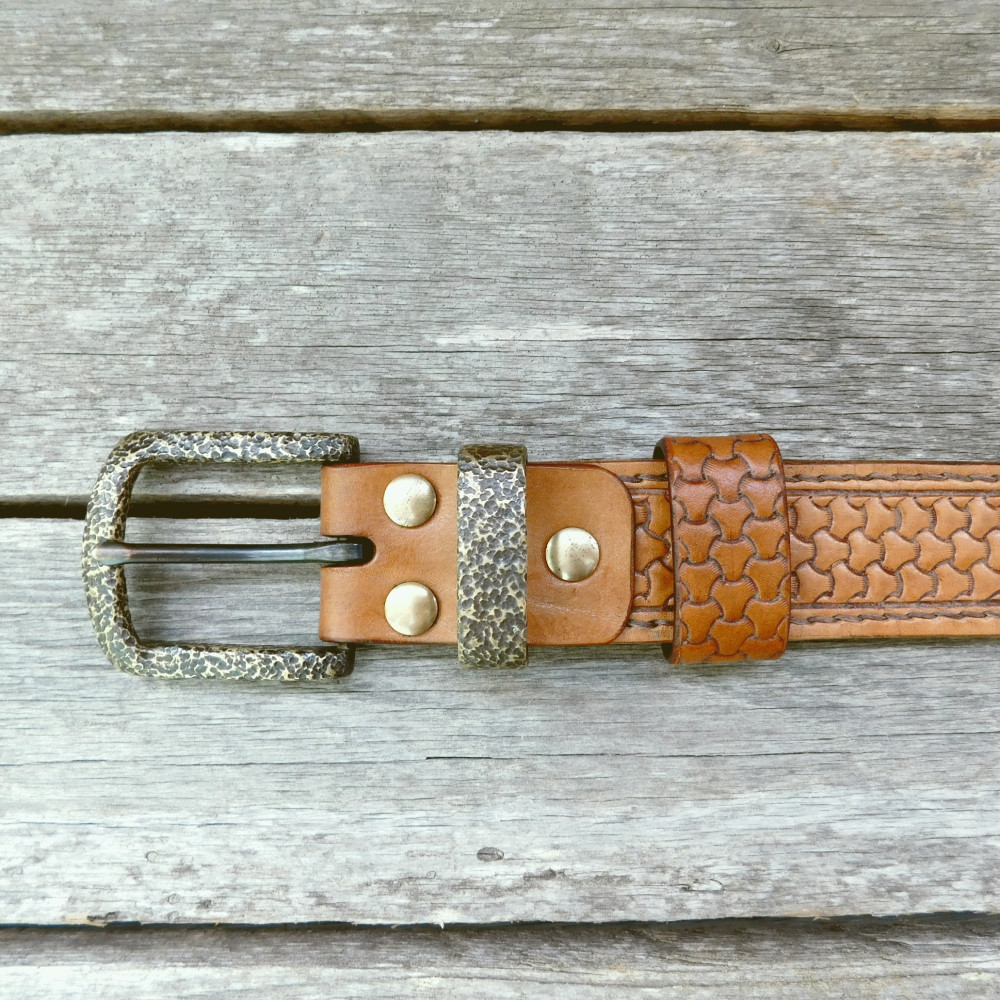 Ремень с комбинированным рисунком "Дуб и корзинка" по всей длине ремня. Ширина - 35мм, ремень прошит по всей длине ручным швом, при работе использовал подкладку из другой кожи (рыжий краст). Цвет - "Шеридан Браун". Ремень прошит по всей длине полиэстровой нитью, используется подкладка. Пряжка - латунь.
