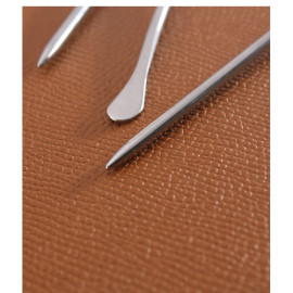 Шпатель для нанесения химии на кожу, двусторонний.Таким шпателем удобно наносить краску на урез, клей и т.д.Материал: нержавеющая сталь.Длина инструмента: 12,5 см