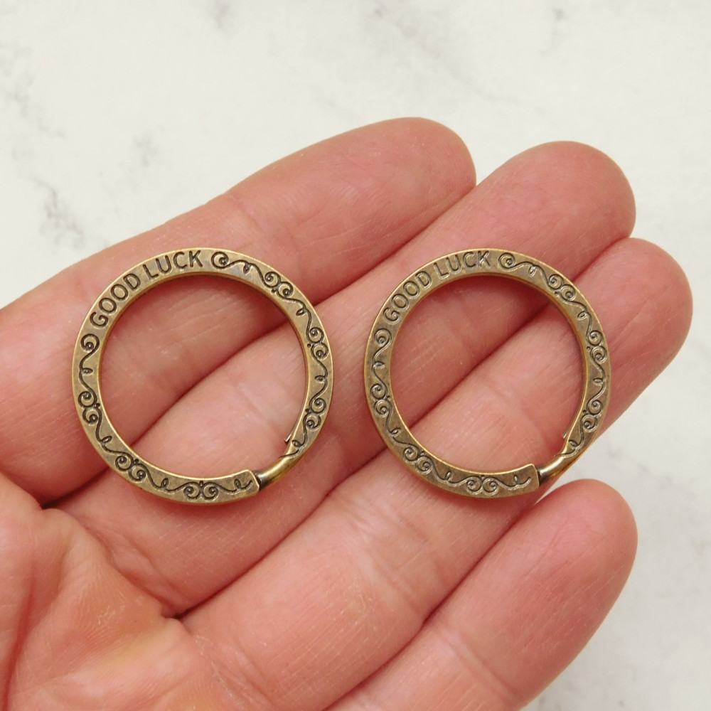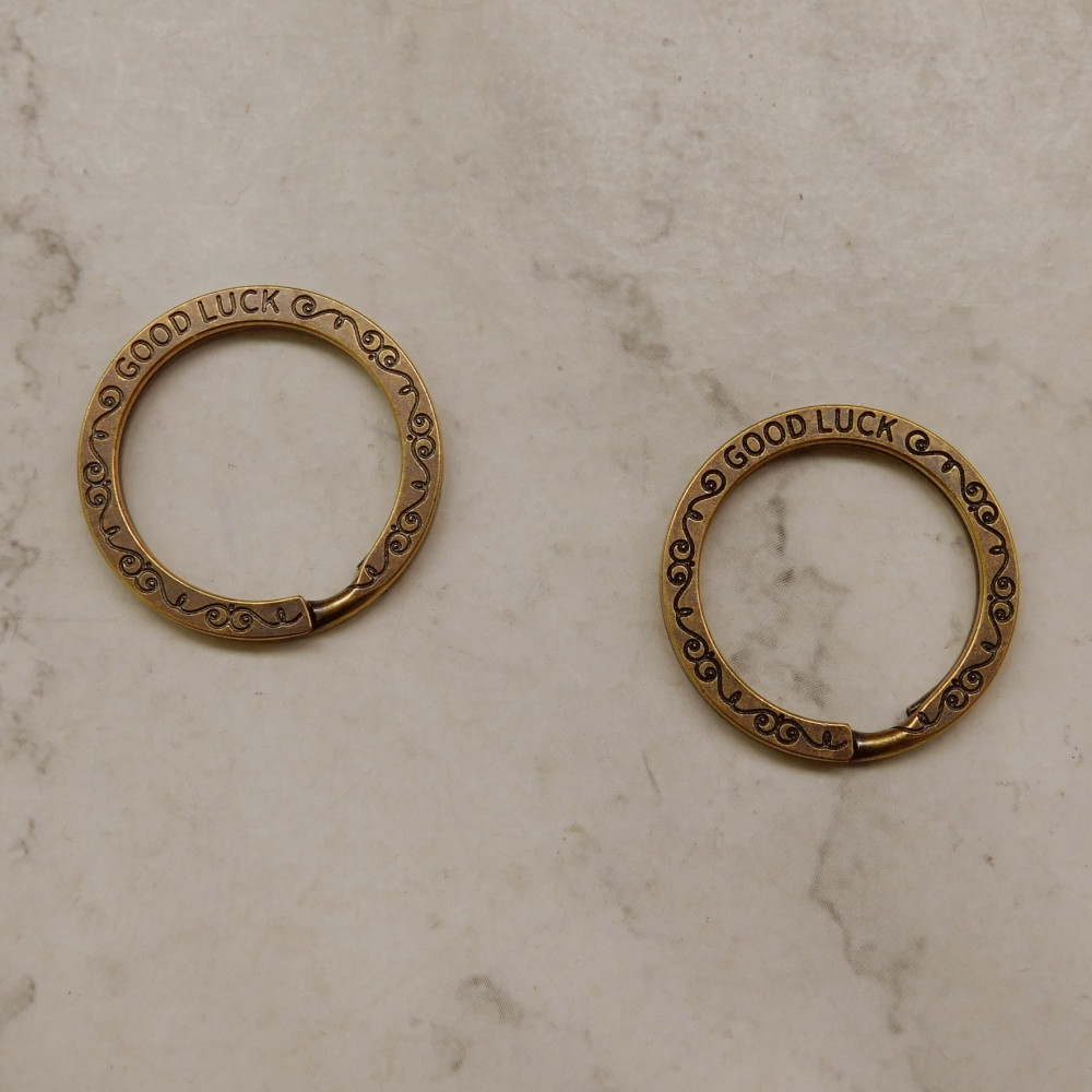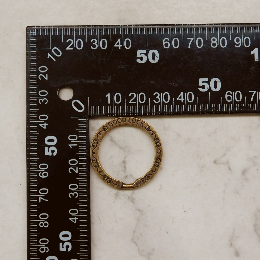 Кольцо декоративное заводное плоское для ключей. С узором и надписью "Good luck" ("удача" или "счастливый случай"). Декоративный узор и надпись выполнены с двух сторон кольца, в углублениях - патина.