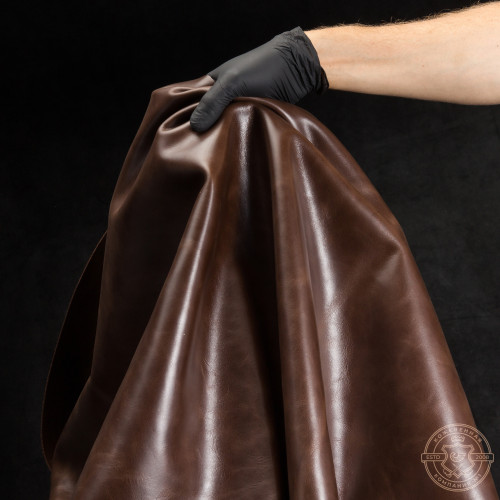 Кожа с нанесением парафина и отличным эффектом пулл-ап. Гладкая обратная сторона. Кожа очень плотная в толщине 1.2-1.4 мм. Площадь: 170-210 дм2, возможны отрезы от 90 дм2 Конфигурация: полукожа (половина целой шкуры) Лицо: натуральное гладкое, без п..