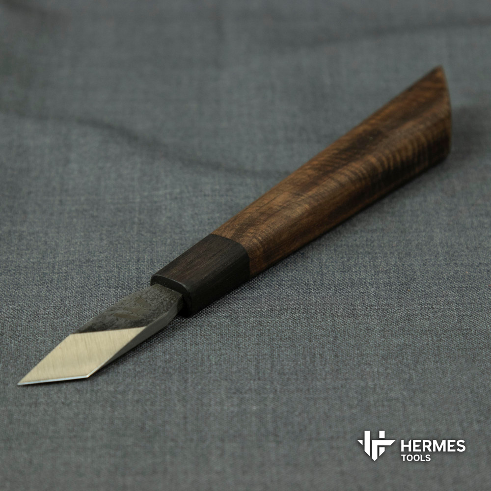 Скальпель изготовлен из углеродистой стали марки 9хс. Клинок прошел закалку, имеет односторонний спуск 15 градусов и прямую заточку (подвод) 30 градусов, твёрдость 60-61HRC.