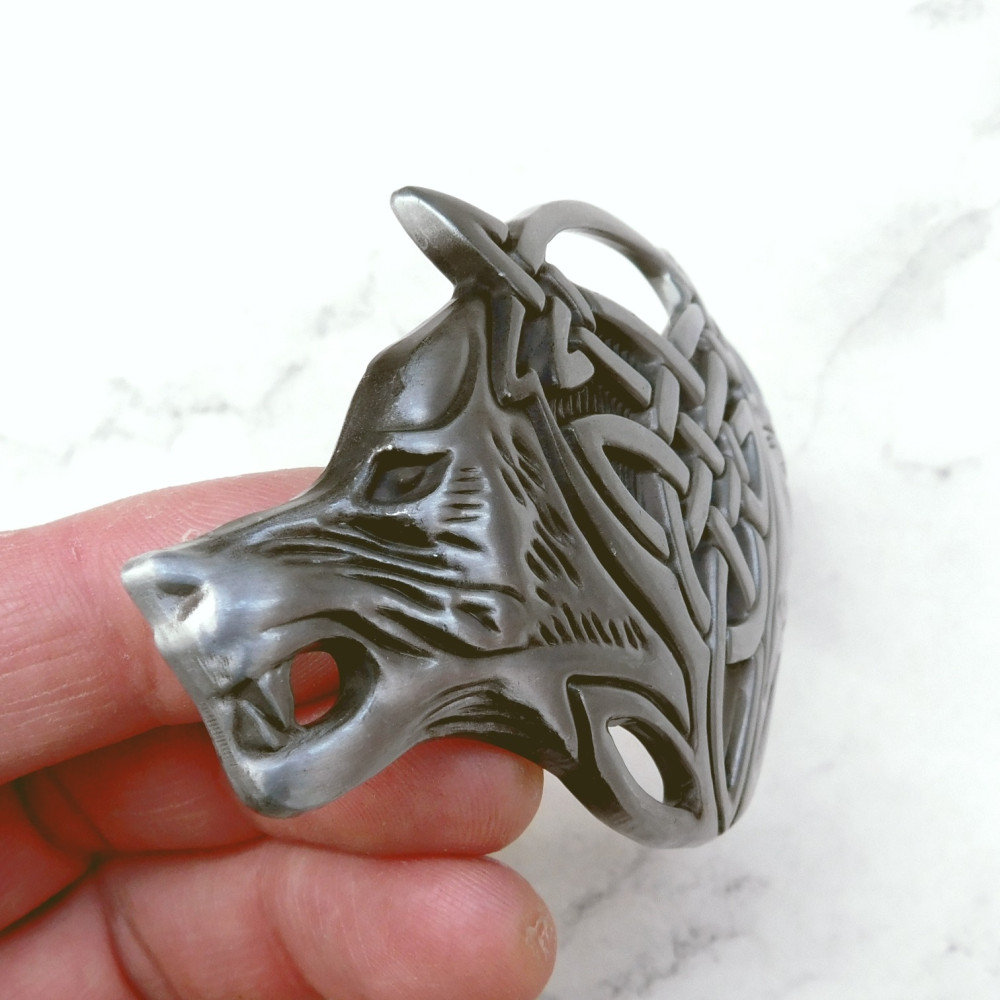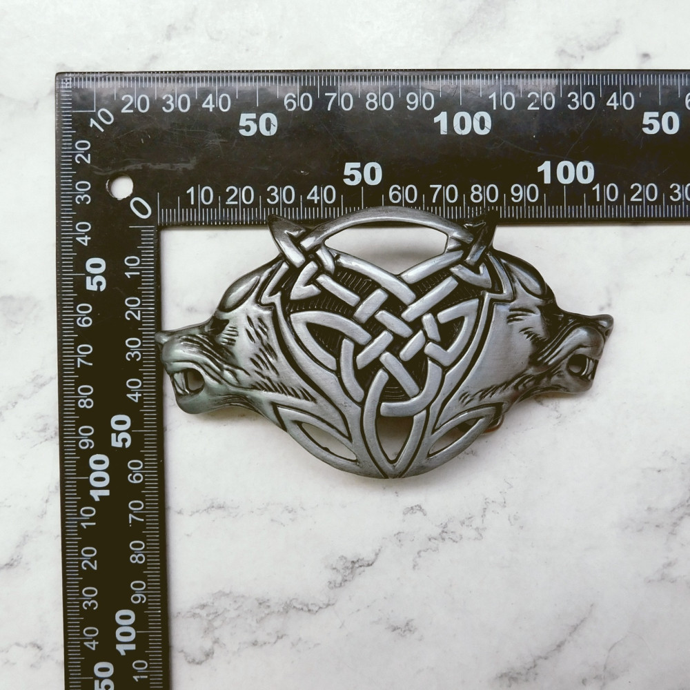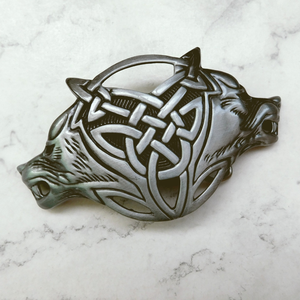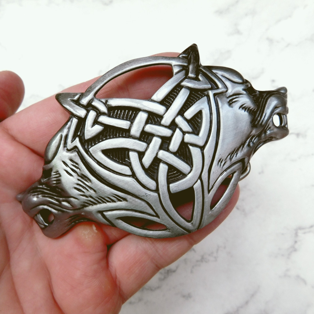 Пряжка кельской тематики с изображением волков. Необычной формы, достаточно большая. Выполнена из металла.