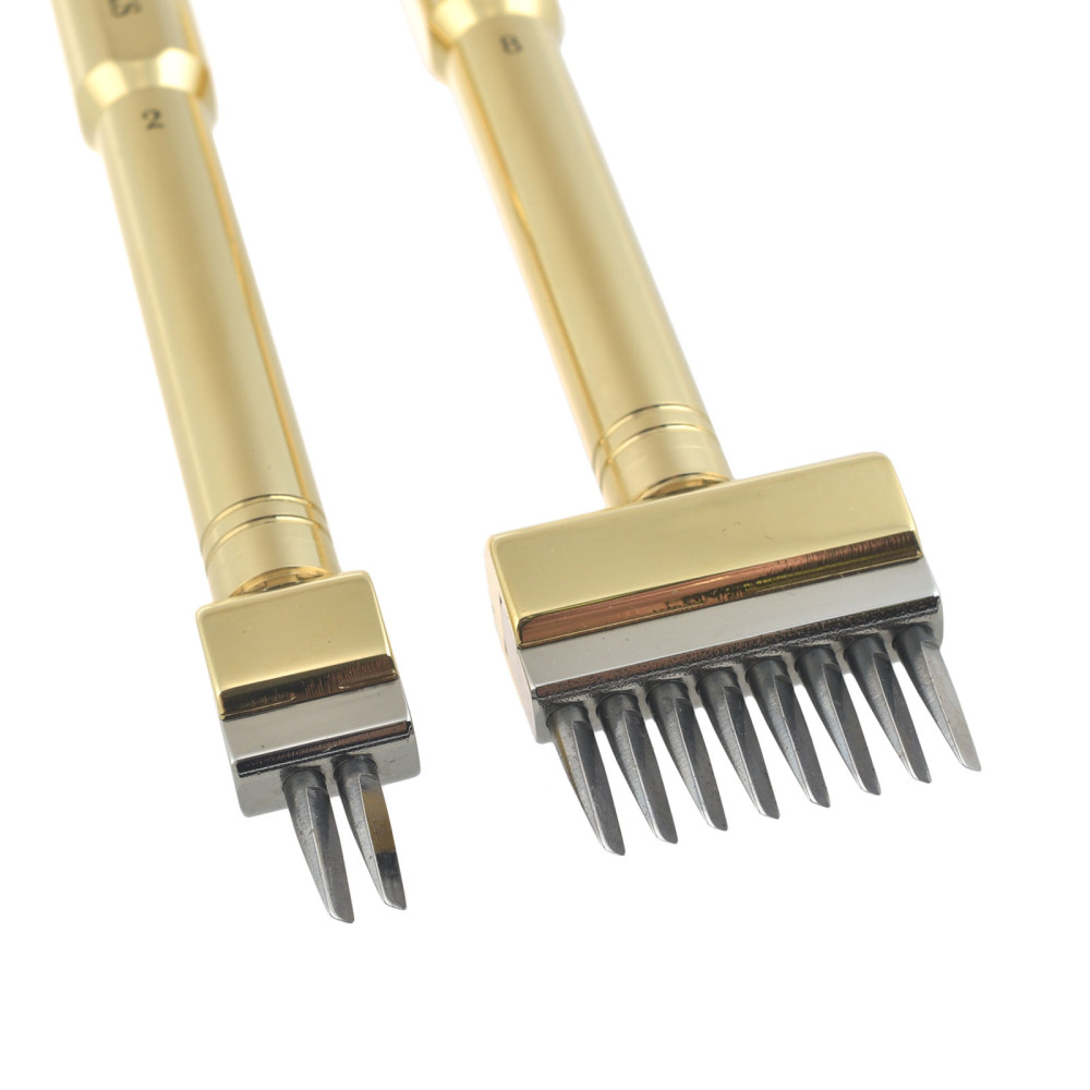 Набор пробойников премиального уровня, европейского (французского) типа от корейского производителя Sinabroks. Сделан из литой латуни и нержавеющей стали, имеет оптимально сбалансированный вес для постоянного использования. Все пробойники имеют полированные зубы для легкого прокалывания даже толстой кожи и оставляют аккуратные отверстия, подходящие под все основные размеры нитей. Оптимальные размеры зубьев пробойника, позволяют работать с ними без дальнейшего использования шила.