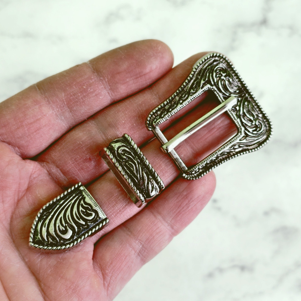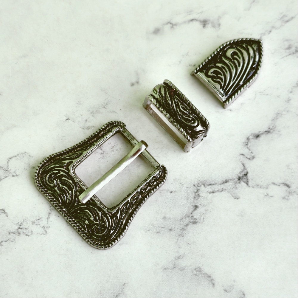 Набор для ремня с декоративным рисунком для ременной полосы до 20мм. Набор состоит трех элементов - пряжки, тренчика (шлевки) и наконечника. Цвет - никель антик + черный. Набор идеально подойдет для .. Читать полностью