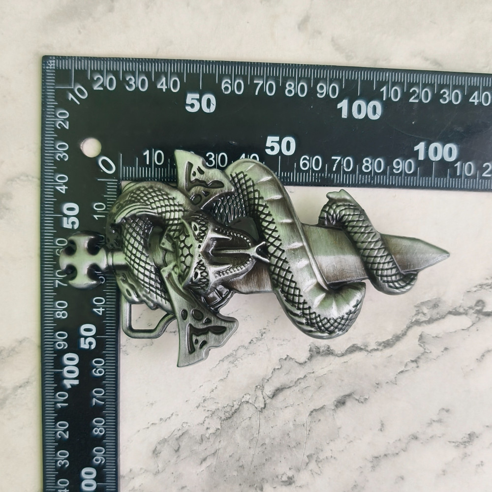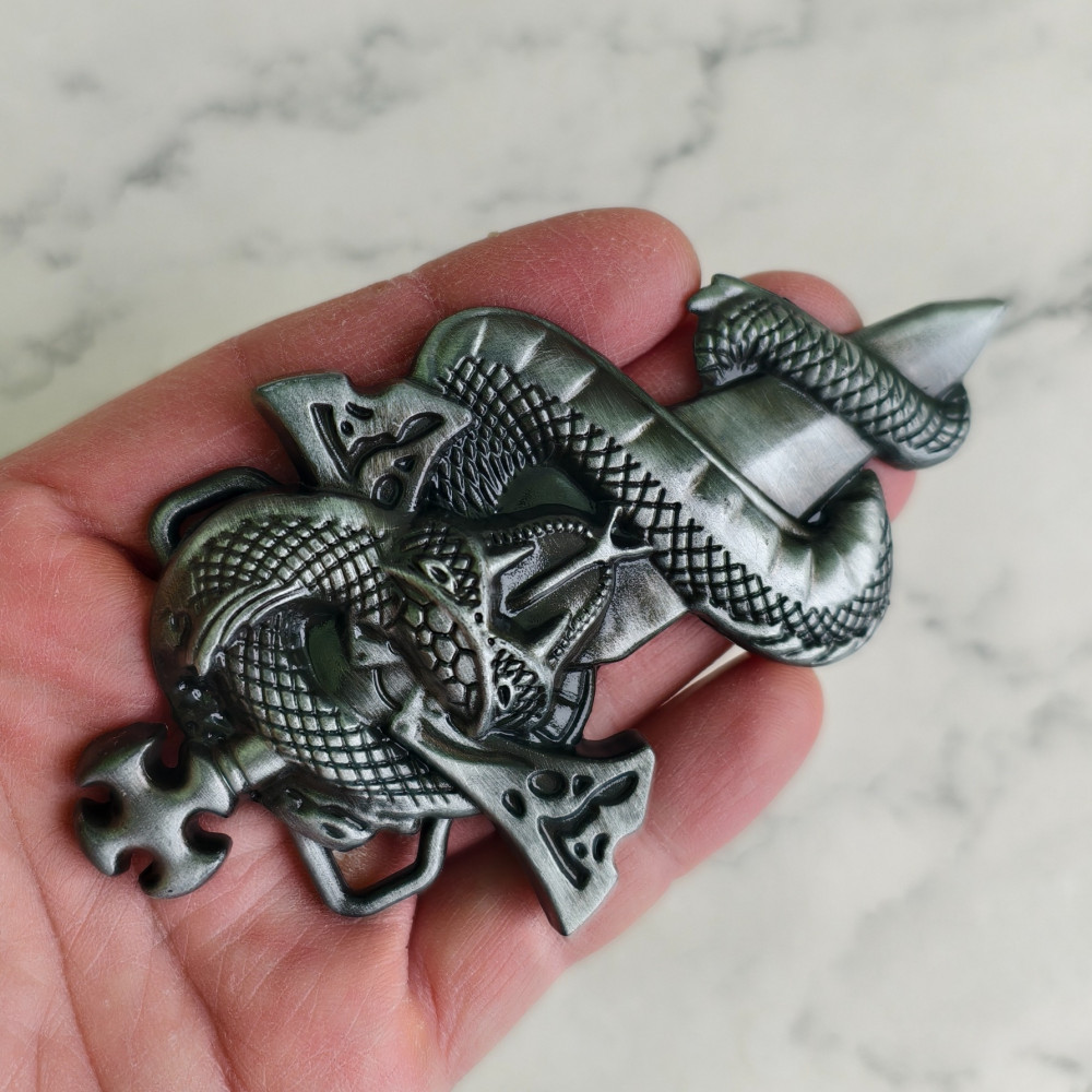 Пряжка "Меч и змея". Выполнена из металла. Застегивается на кобурную кнопку-крючок. Подвижная дужка. Размеры: Внешние размеры - 6,18*12,02см внутренний размер ширины ремня - до 43мм диаметр шпенька к.. Читать полностью