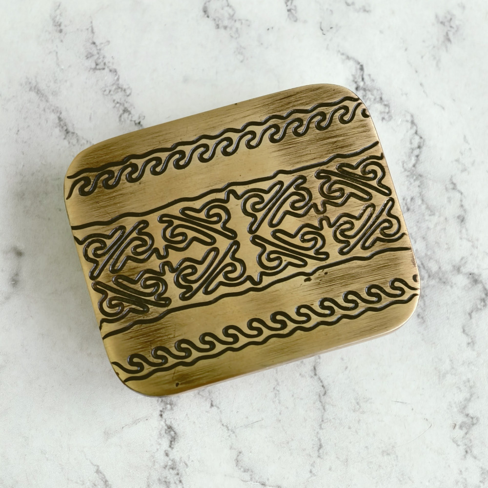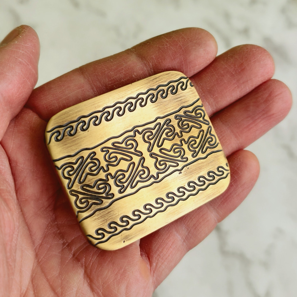 Пряжка с узорами выполнена в контрастном стиле. В углублениях - темная патина, снаружи - чистая латунь. Пряжка подойдет для мужского или женского ремня.