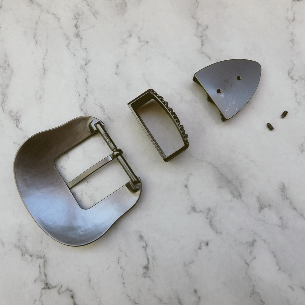 Набор состоит трех элементов - пряжки, тренчика (шлевки) и наконечника. Цвет - темный никель (античный никель).