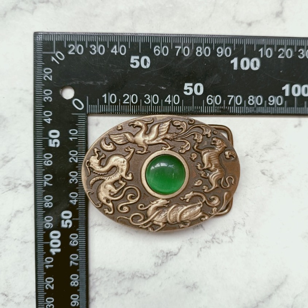 Пряжка декоративная "Мифические звери" выполнена из латуни в технологии литья. Посредине пряжки - камень изумрудного цвета.